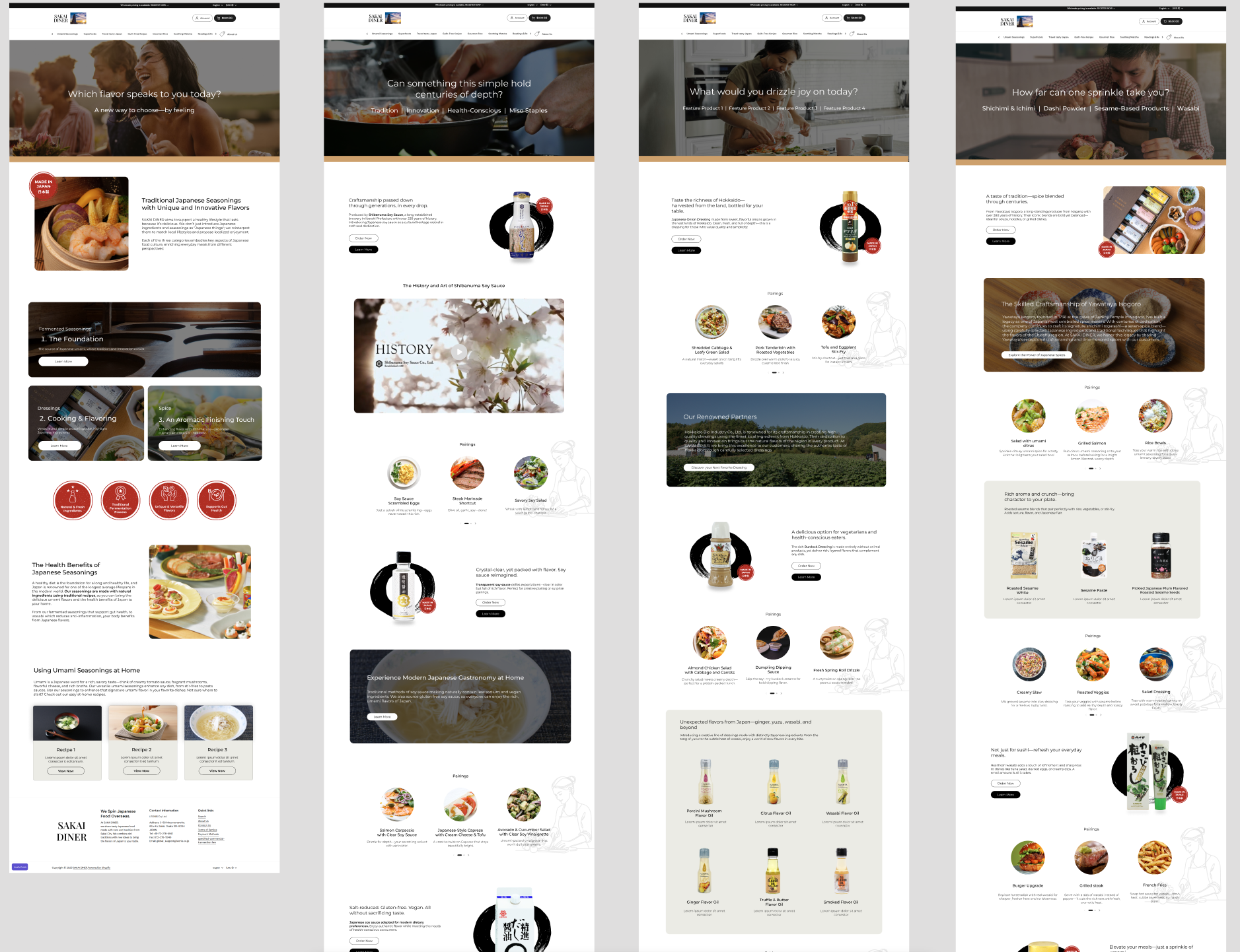 I designed an intuitive navigation structure that guides users through an educational journey about umami and Japanese seasonings. The design process involved several iterations to balance Sakai Diner’s content requirements with user needs, ensuring we included all the information they wanted to convey without overwhelming visitors. The final design included sections that follow a hierarchical structure that builds trust and drives product engagement: each section features the product prominently in the center, optionally includes any meaningful tradition and background information, and concludes with smaller quick-view recipe suggestions. This layout strategy increases user interest while reducing friction in the path to purchase. I designed button hover states and carousels for a clean view of recipes/pairings without overwhelming the viewer with information.